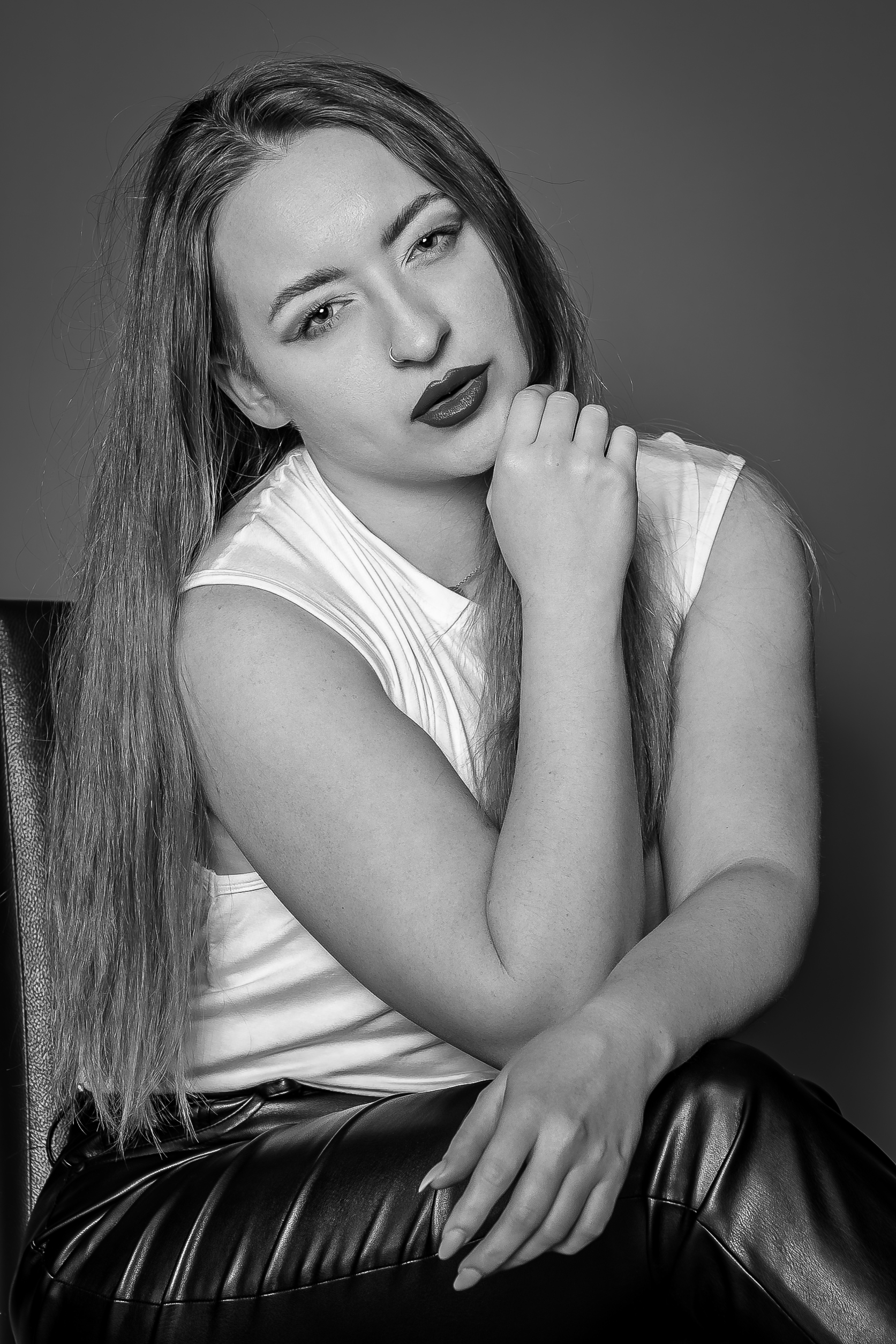 Pensive Perfection Pensive perfection, captured in monochrome mystery. ✨ Portraits Kira Bangauf 22/01/2026 Studio One, Melle GM35MM, Sony A7 IV