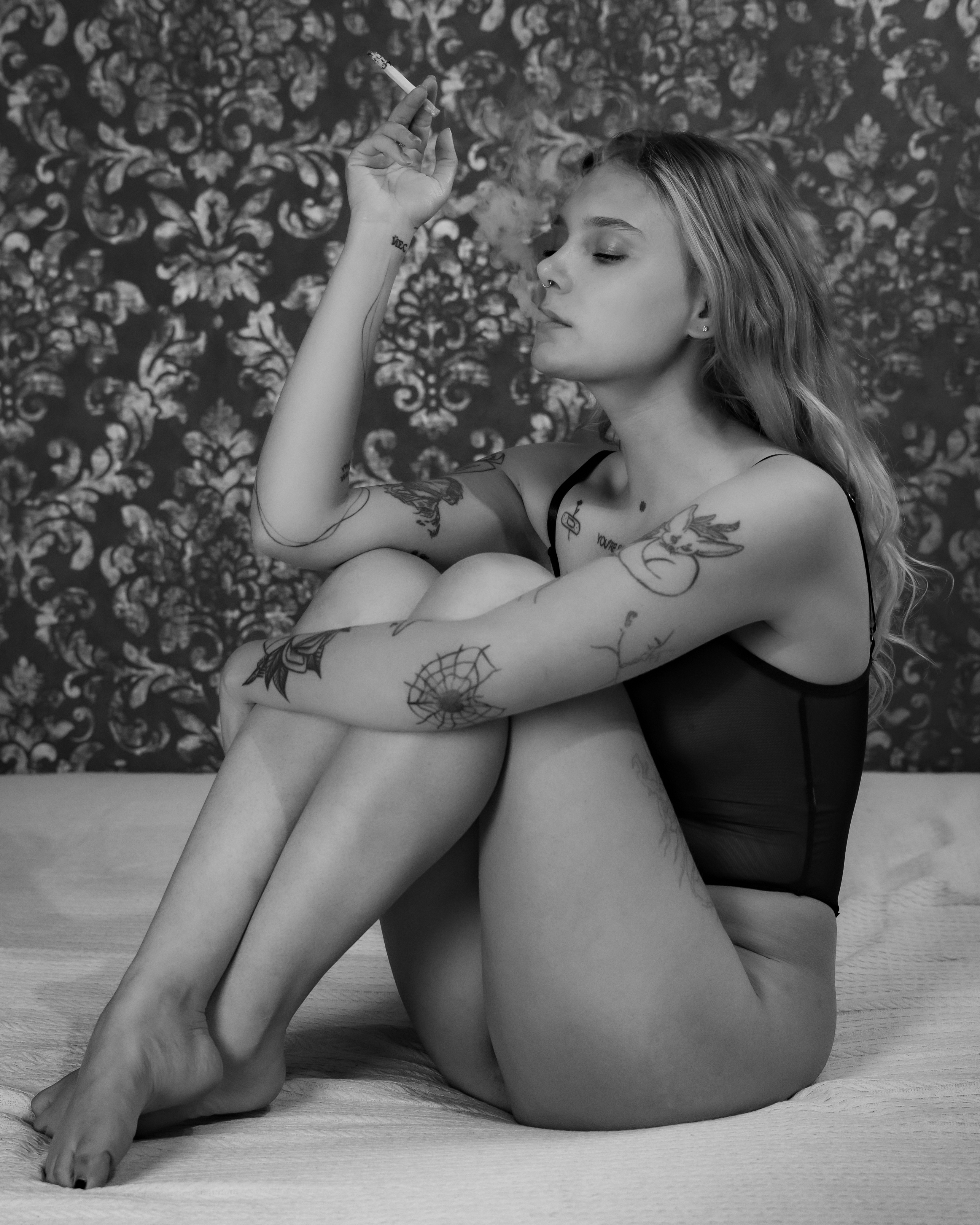 Somewhere between yesterday and never, she sits – bare in thought, dressed in ink and haze. The cigarette isn’t a habit; it’s a metronome of stillness, marking time for memories too soft to speak. An urban still life, a quiet portrait of melancholy wrapped in tattoos and breath. Each line on her skin carries a story she never told out loud. The smoke rises like a whisper, curling through the silence. No movement. No smile. Just presence.